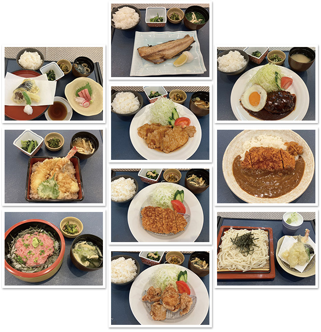 赤松膳(刺身・野菜天ぷら他)/天重/ネギトロ丼/ほっけ焼き定食/豚生姜焼き定食/トンカツ定食/鶏から揚げ定食/ハンバーグ定食/カツカレー/天ぷらそば又はうどん/限定 日替り膳